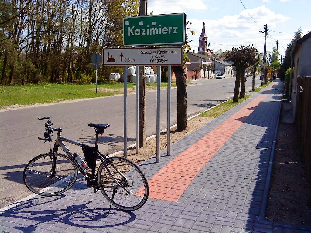 Za zakładem skręcam w lewo w kierunku Lutomierska. Jadę z górki przez Babice. Dookoła żyzne pola i okazałe posiadłości ziemskie. Skręcam w prawo i pedałuję szybkim tempem, nową gminną drogą do wsi Kazimierz. To bardzo stara miejscowość - pierwsza wzmianka o Kazimierzu pochodzi z 1261 roku ! |